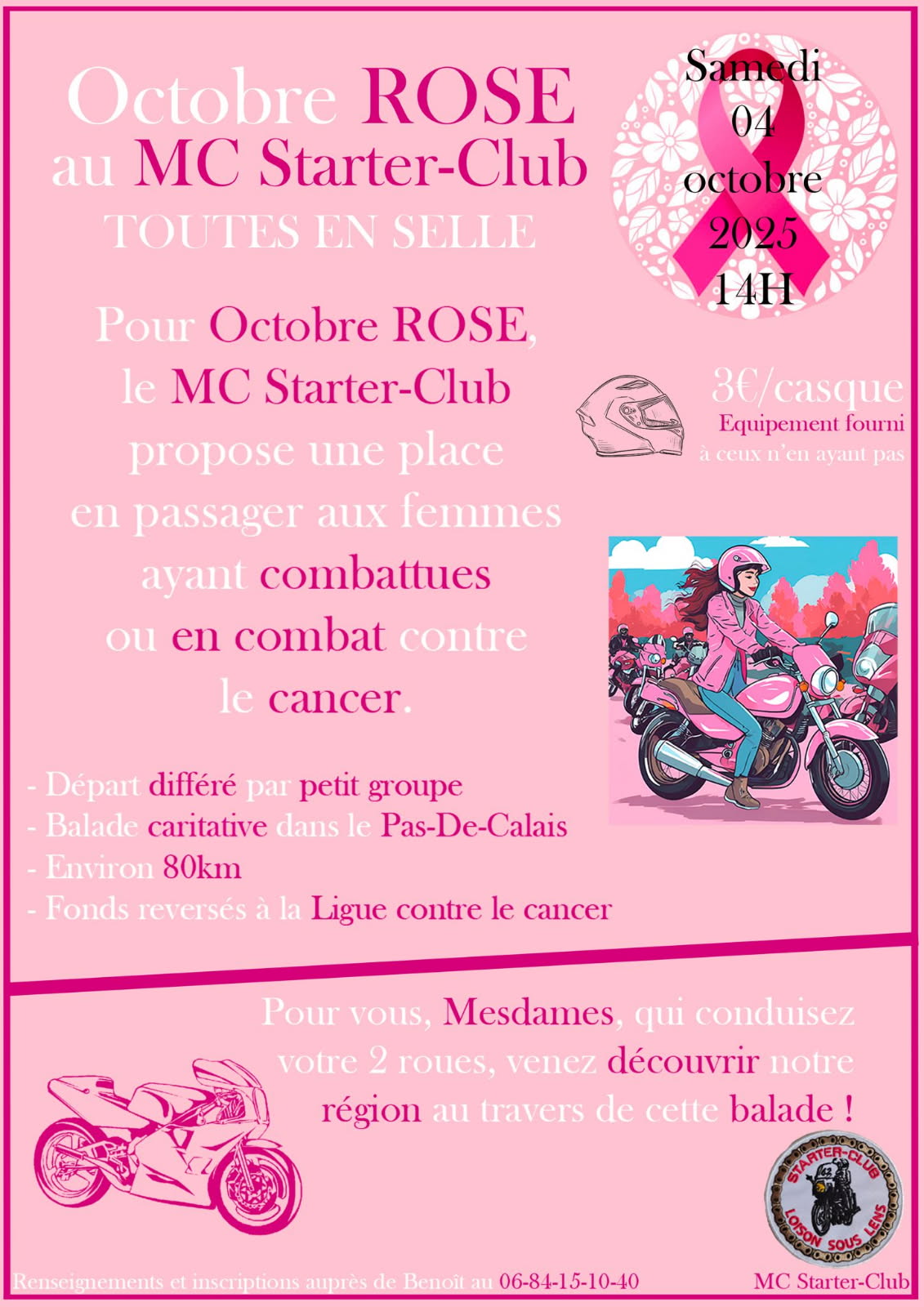 Le Starter Club organise un moment d'évasion aux personnes qui ont été ou sont concernées par un cancer. Une balade leur est donc proposée le samedi 4 octobre 2025 après-midi à bord d'une moto pilotée par un motard expérimenté.