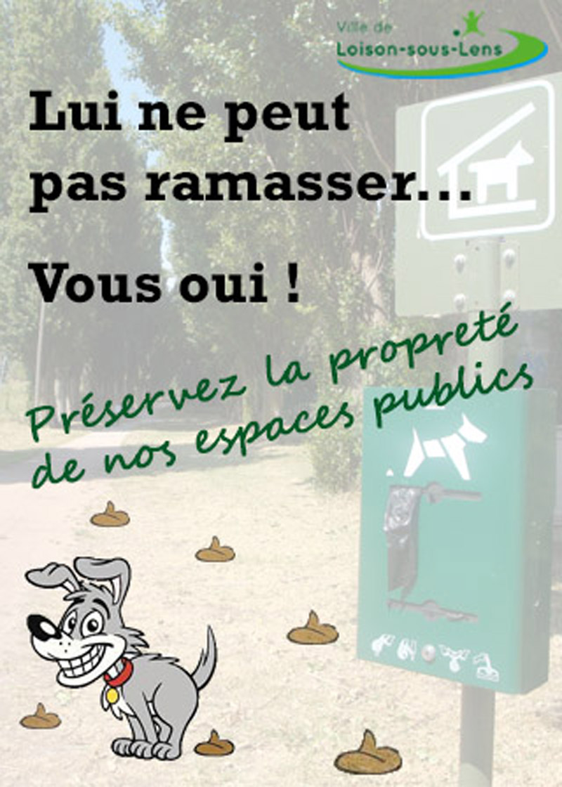 La propreté de la ville est dans l’intérêt de chacun et nous concerne tous. Les services techniques municipaux entretiennent l’espace public mais de nombreuses incivilités nuisent au quotidien des Loisonnais, notamment en terme de déjections canines. Soyons tous acteurs de la propreté ! Nos trottoirs et espaces verts ne sont pas des toilettes pour animaux !