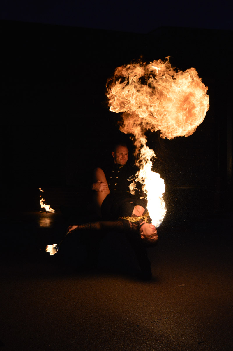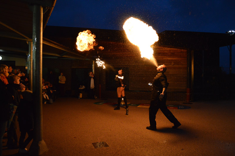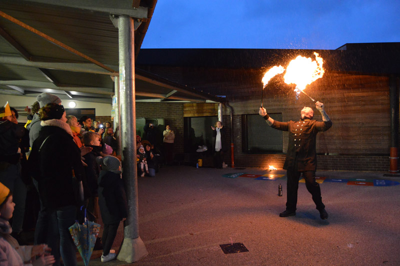 Puis la compagnie VadeRetro a présenté un spectacle de cracheurs de feu dans la cour de l’école L. Ventura. Malgré la pluie, les différentes figures ont subjugué le public, petits et grands en ont pris plein les yeux.
