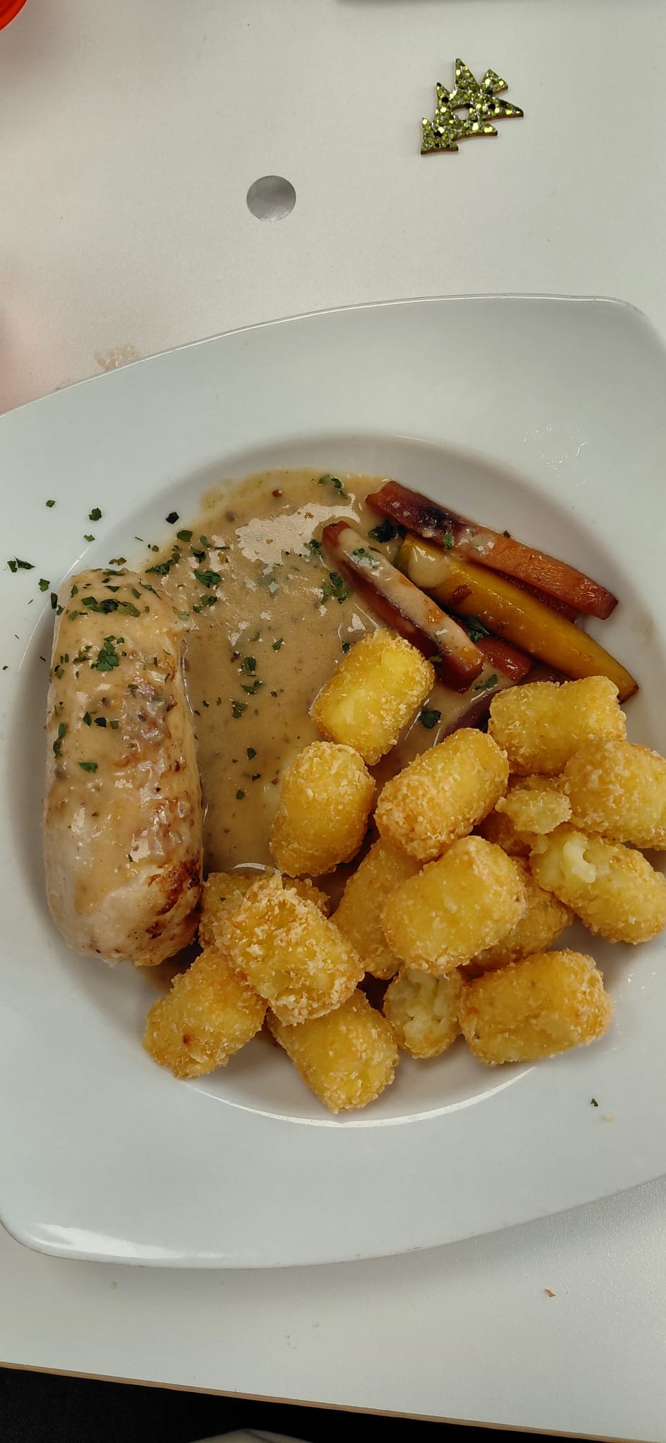 Le service restauration a également régalé les enfants qui se restaurent dans nos cantibnes scolaires. Au menu cassolette de la mer en entrée suivie d'une ballotine de poulet avec un insert de comté servie avec des carottes et des pommes de terre, pour terminer par un sapin en chocolat.